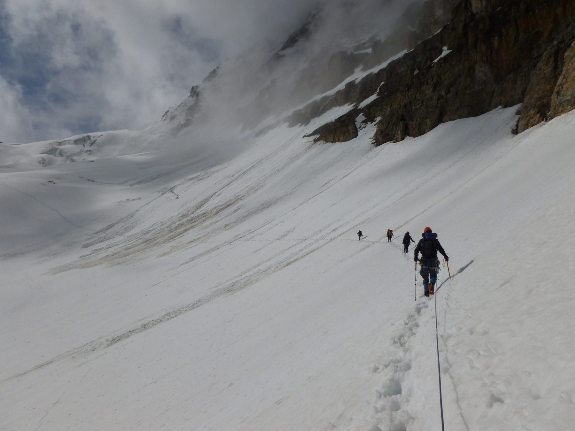 A great meal along with a good but short sleep had us waking up to rain. It is always hard to motivate at 4:30am…but even harder to motivate when it is raining outside!! After 15 minutes of humming and hahing..we finally got up. As we hiked to the glacier the weather was still pretty iffy…but by the time we actually roped up and started pitching out the ice tongue, the clouds started to break! The girls led their own ropes up the tongue and as it finally benched out we got into glacier travel mode. The travel was pretty good and we had amazing views on the top of A2 along with watching a car sized cornice failure off the nearby ridge of Athabasca.