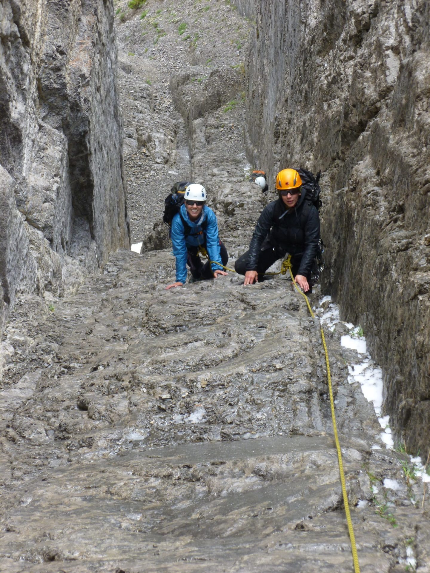 The weather man was right…the next morning was cold, wet and well…slightly miserable! There was snow on our little doorstep, but we were up there, so of course we had to try! As we approached Eisenhower we had moments of views, and moments of hope. The crew broke into 2’s again and started up the dragons back. Of course climbing in boots on slippery wet and cold limestone adds a whole new dimension to the day. Every did so well, whether leading or following, just being out there in those conditions and the eeryness of the fog surrounding us. It was a cool place to be…but also very very cold. After a pitch on the tower itself we opted to head down. Everyone was wearing all their layers and we were psyched with how far we had come!