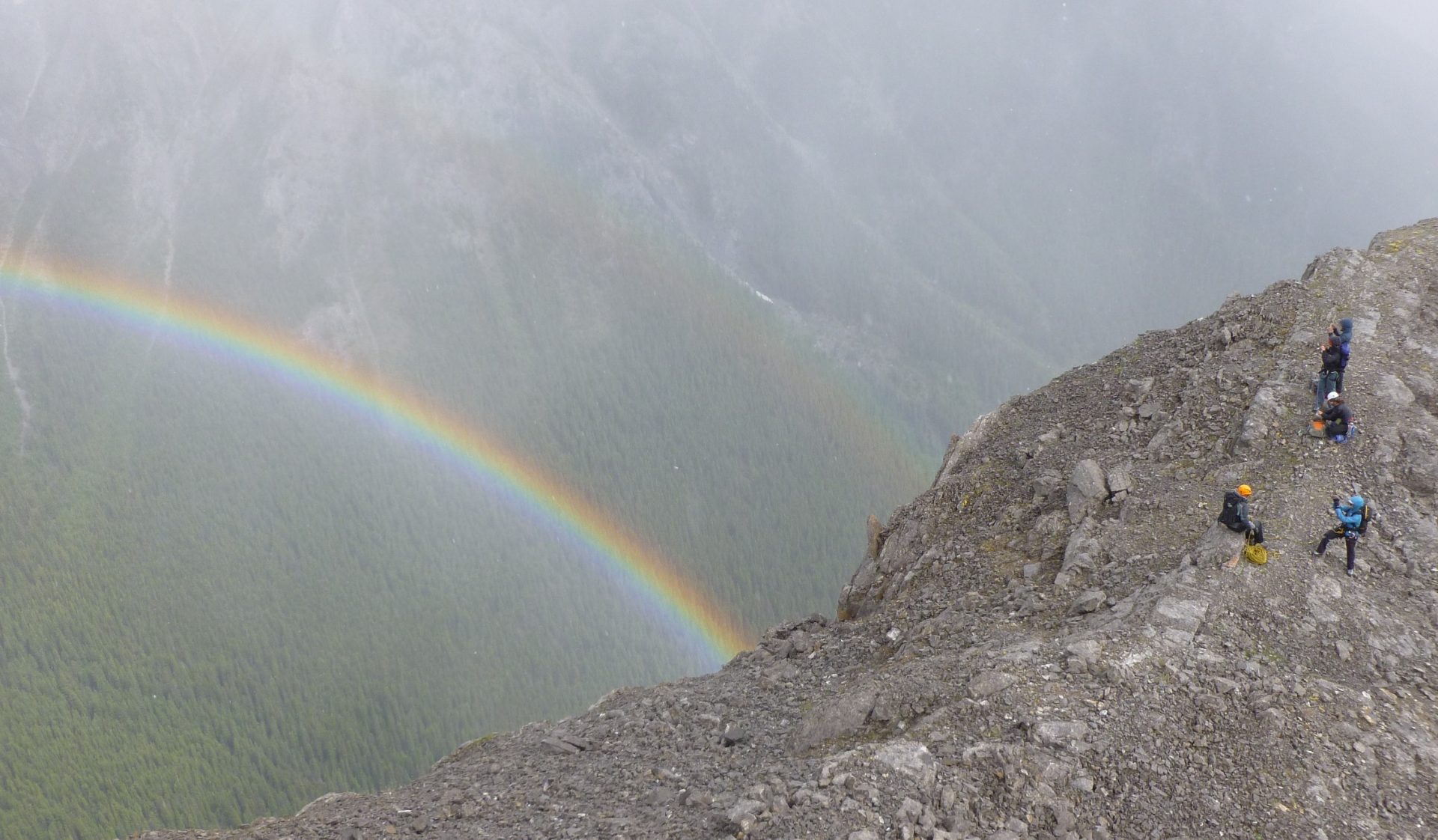 Another alpine start had us on the road by 6:30 and at the Mt Edith parking by 9am. So far the weather was holding…we knew this was a bit of a late start for the peak, but so long as the weather held, we felt we could do it! The hike up went quickly and soon we were pitching out the big gash on the south peak. great leading by the ladies despite the small hail storm on pitch 2! My memory of the anchors was seriously challenged though, as we really couldn’t find the last one. As we crested the ridge the skies released but only long enough to expose an amazing rainbow…pretty cool to be above a rainbow!