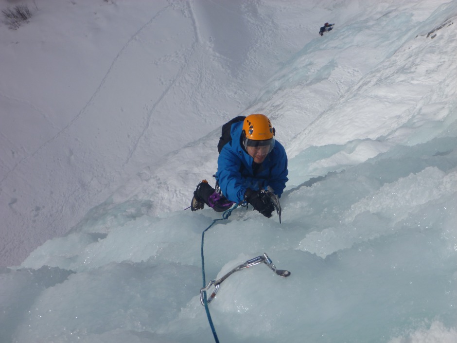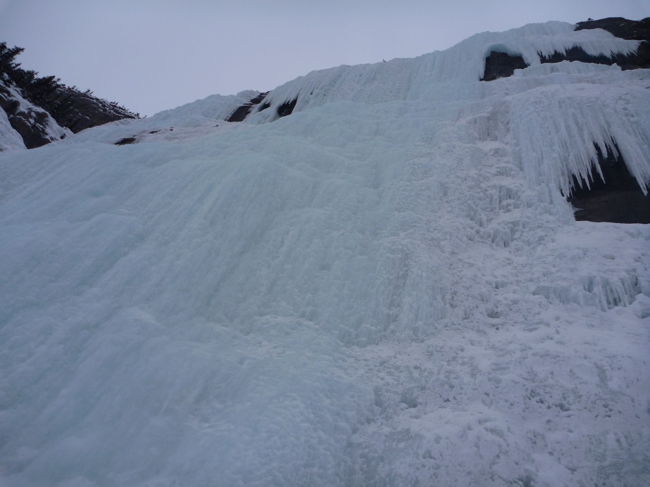 To speed things up a bit, I dragged up two ropes for the first pitch and Ken and Tim worked together climbing side by side. It was cold, the ice was dry and this was a 60 meter Grade 4 stretcher in -20 temps…can you say screaming barfies??? In both hands and feet?? The three of us all found our own definition for this lovely term of ice climbing endearment as we hunkered under our ice overhang at the first belay. In good spirits though, we started up the crux pitch. More dry, completely reformed vertical ice lie ahead and after 60 meters eased off to a comfy ledge.