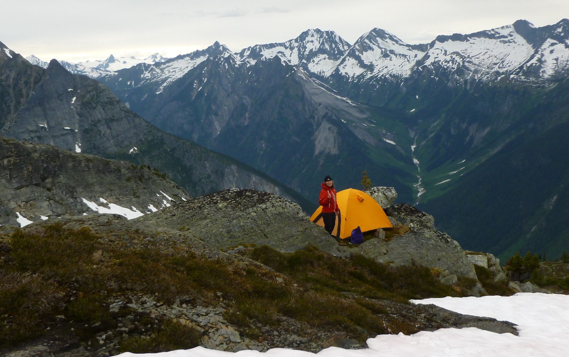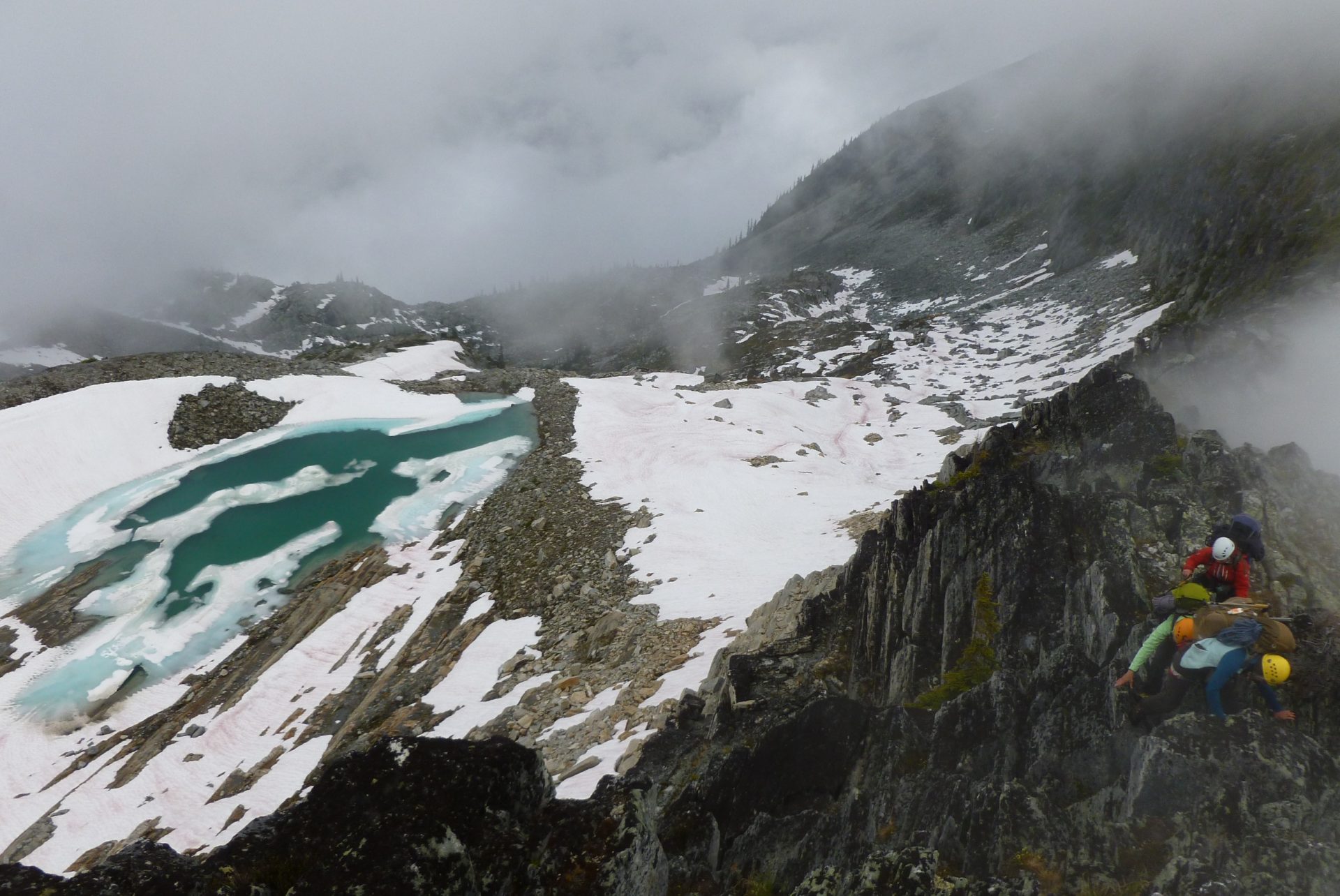 We arrived at Rogers Pass to a good weather forecast and blue skies…just what we needed to really try this objective! After a good packing session in the parking lot, and crucial decision making over shelters and other key items, we started up towards mt Abbott. Just getting to the first peak involves over a 1000m of elevation gain! This is no small task with the loads we were carrying. As we approached a decision point the weather started to set in. Clouds that strongly suggested an electric storm had us calling it a day at the base of Abbott. There is a great little lake, good flowing water and a few flatish spots for tents just off the ridge near Abbott and so we took advantage of this last good bivy spot before the ridge would unrelent for the next stage.