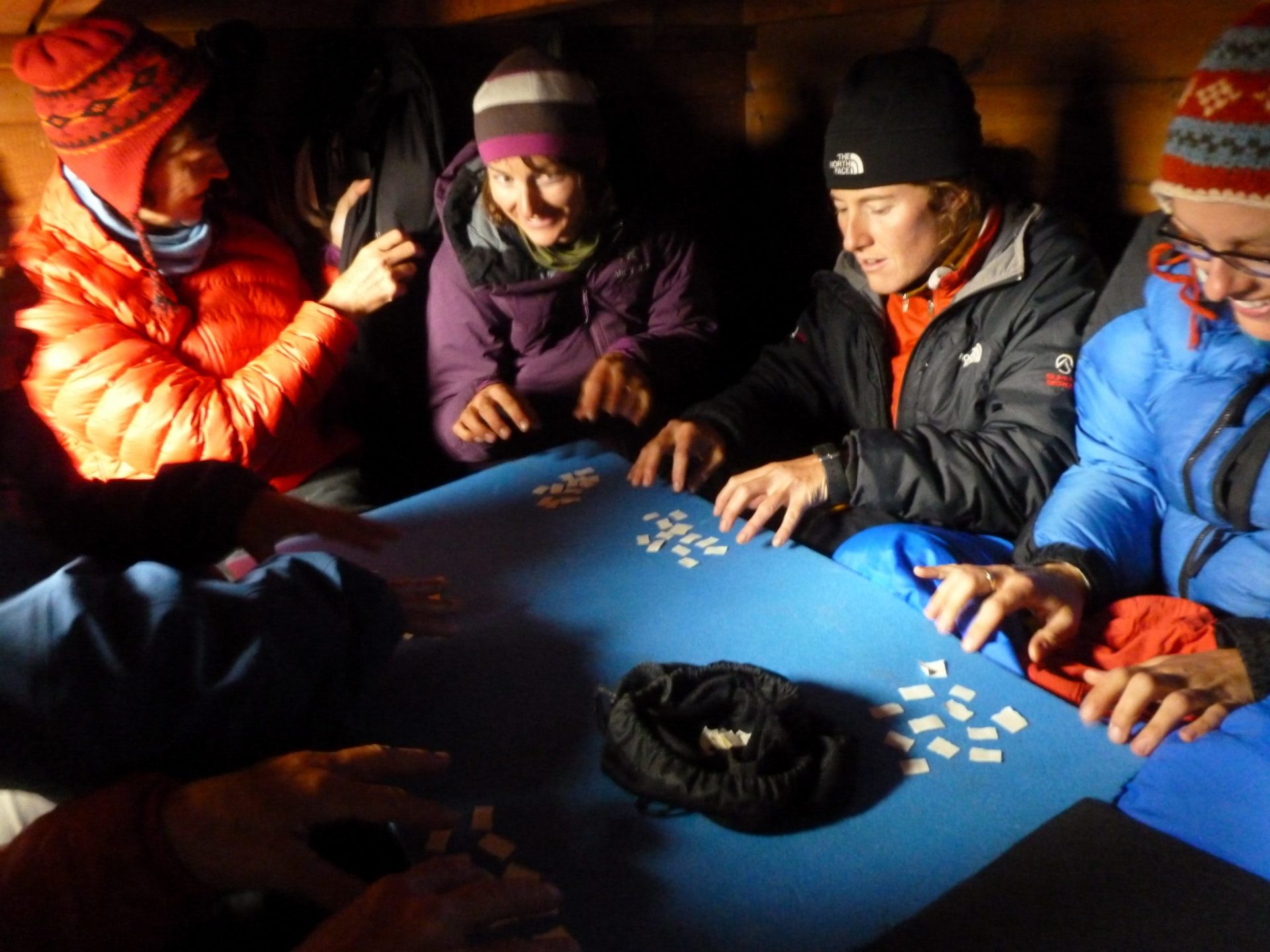 The next morning…rained again:( Kir and I hardly slept in the tent as the temps were quite cold. Everyone in the hut seemed well rested though and we all decided to have a forced rest day due to the weather. We filled the day with an attempt on Dome (we should have brought the ropes up there!!), some anchor work and some fun filled hours of bananagrams made out of paper! hilarious….