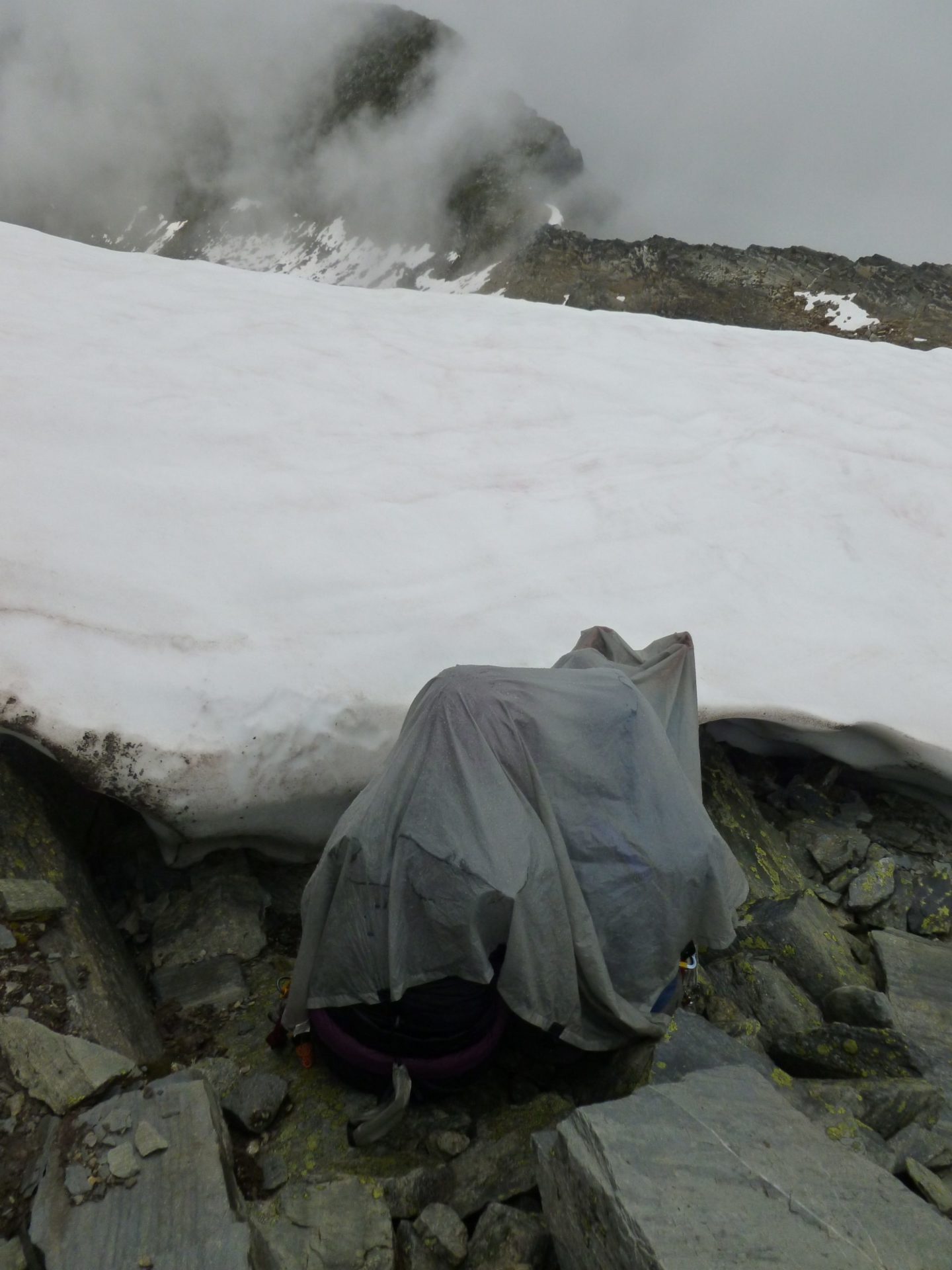 After we found our way down, we hit our next small challenge…a bump between Abbott and Afton. After some scouting, we decided to take the snow around it instead of up and over. At this moment though, the rain really came down! We pulled out the megamid and siltarp and hunkered down. 20 minutes later we made the snow traverse and started up Afton. This required a rope, with our heavy bags and the every slippery quartzite. Numerous pitches in sometime downpouring rain eventually got us to the summit!! Some more hunkering time under our tarp, a fixed line for the summit traverse, and some entertaining down climbing got us to the Rampart, Afton col.