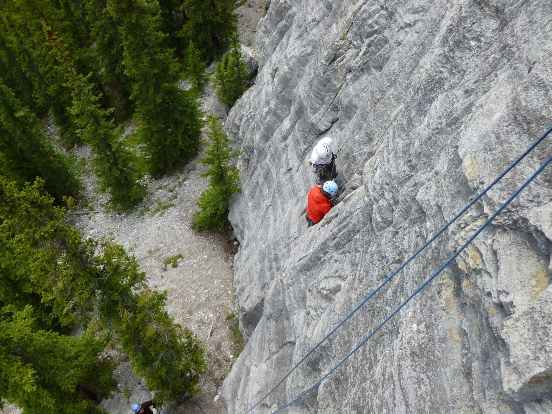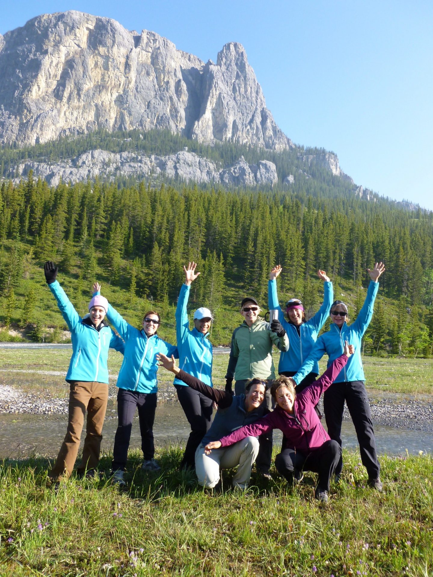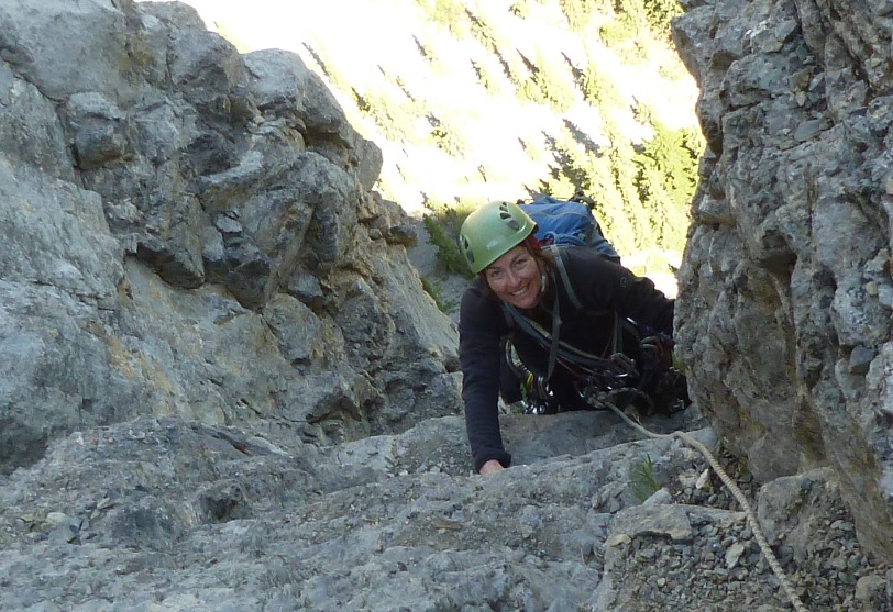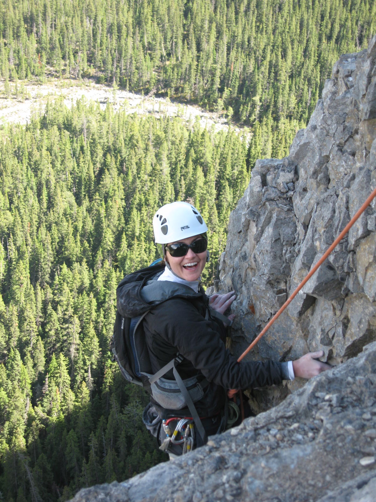 Smiles all around at the campfire that night. Great days had by all and everyone went to bed with dreams of more limestone cracks dancing in our heads. Sadly though…as night fell so did the rain. And it fell and fell and fell. Our morning wake up time was delayed by 2 hours and as Lilla rolled back in from her drive from Canmore, we started to get the coffee brewing. Everyone wondered what the day would bring…a good book? Rescue skills in the trees? A wet hike?…..nope…by 10am the sun started to shine and the three groups were off to the original agenda…Kris Laura and Sonja to Bonanza, Lilla, Andrea and Diane to get their trad leads on, and Claire, LeeAnne and Sarah to Macadiamia.