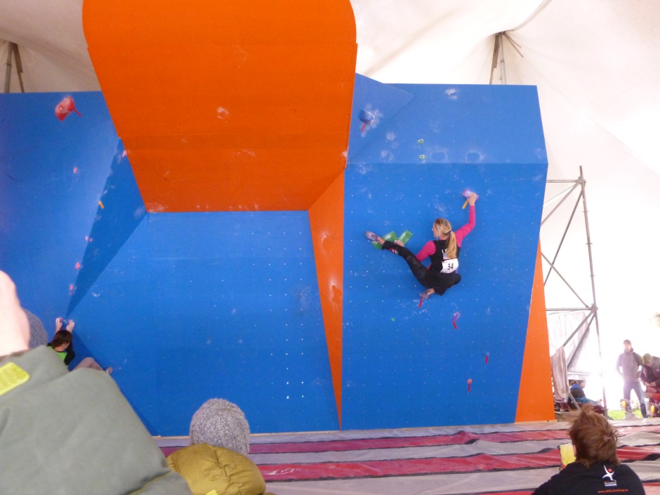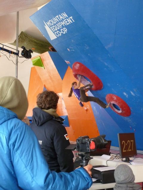 I don’t think I realized what it meant to have Canmore host the World Bouldering Competition, until it actually came here and I watched it. As luck would have it Friday snowed and so my work was cancelled and I was able to attend day one of the competition. A good showing came out to watch the event, but the cold and wet weekday enabled the spectators that were there good views in the tent pretty easily. My friends and I were able to sneak up to the front to get an up close and personal view of the competitors working their magic.